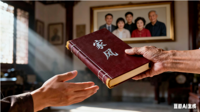 本作品定格了长辈向晚辈递出“家风”册籍的瞬间。画面中布满岁月痕迹的手与年轻的手掌交相呼应,背景的全家福与古雅的室内陈设烘托出家族的温度,让无形的家风精神化作可触可感的传承仪式,一递一接间,家族的精神传承在时光里流转