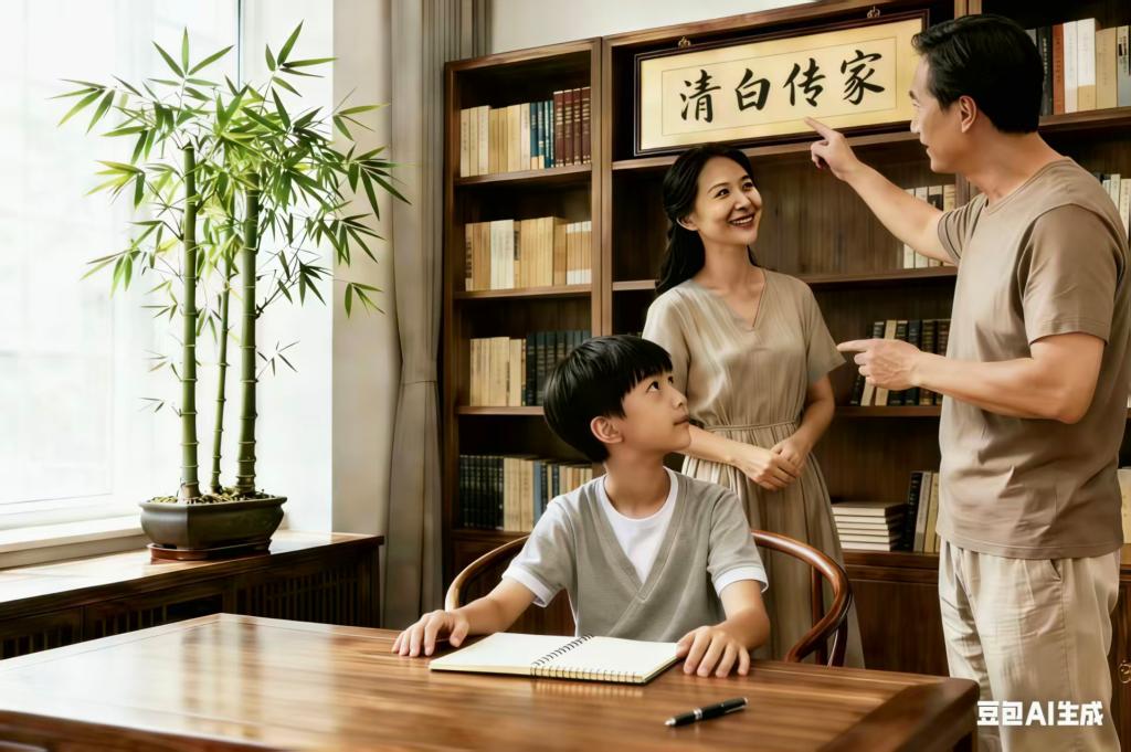 本作品采用写实画风描绘出家庭中长辈向孩子讲解“清白传家”匾额的温馨场景。以竹影、书斋为背景,将廉洁家风的传承融入日常亲子互动之中,既展现出中华廉洁文化以家为基的深厚内涵,也通过具象化的视觉表达,诠释了“清白家风”代代相传的价值理念。
