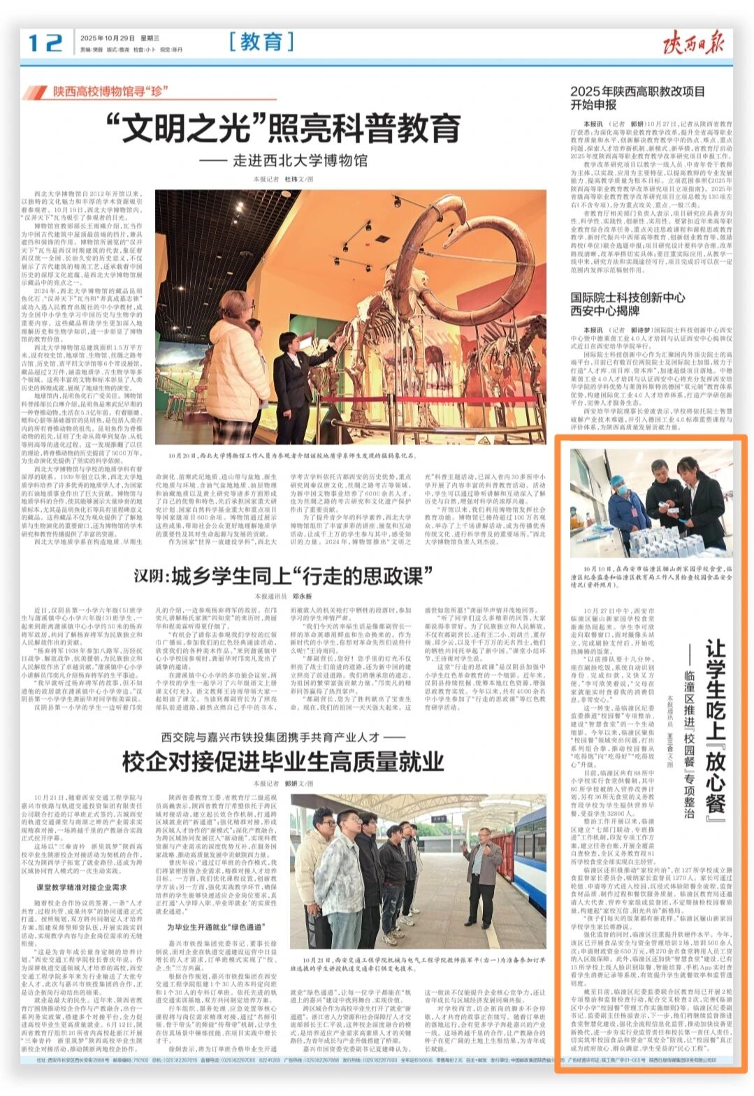 10月29日,陕西日报12版刊登文章《让学生吃上“放心餐”——临潼区推进“校园餐”专项整治》,以下全文转载。
