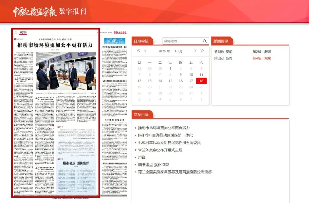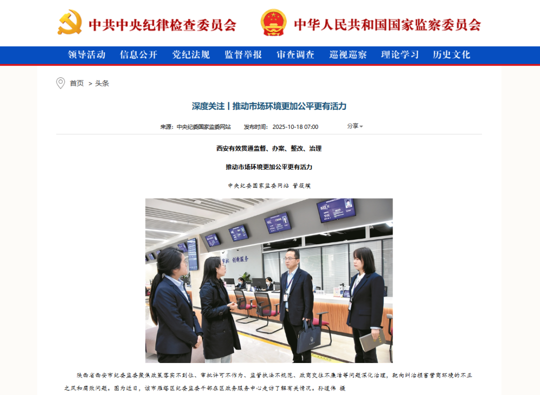 10月18日,中国纪检监察报4版、中央纪委国家监委网站头条栏目共同刊登文章《西安有效贯通监督、办案、整改、治理 推动市场环境更加公平更有活力》,其中宣传报道我区靶向纠治营商环境堵点难点瘀点问题,建立常治长效机制。以下全文转载。