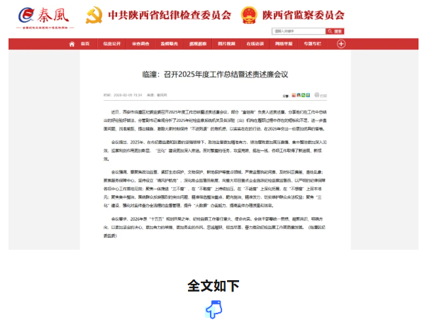 2月5日,秦风网刊登文章《临潼:召开2025年度工作总结暨述责述廉会议》,报道我委总结2025年各项工作开展情况,进一步直面问题、找准差距,以坚定的决心、有力的举措、务实的作风,推动纪检监察工作高质量发展 。以下全文转载。