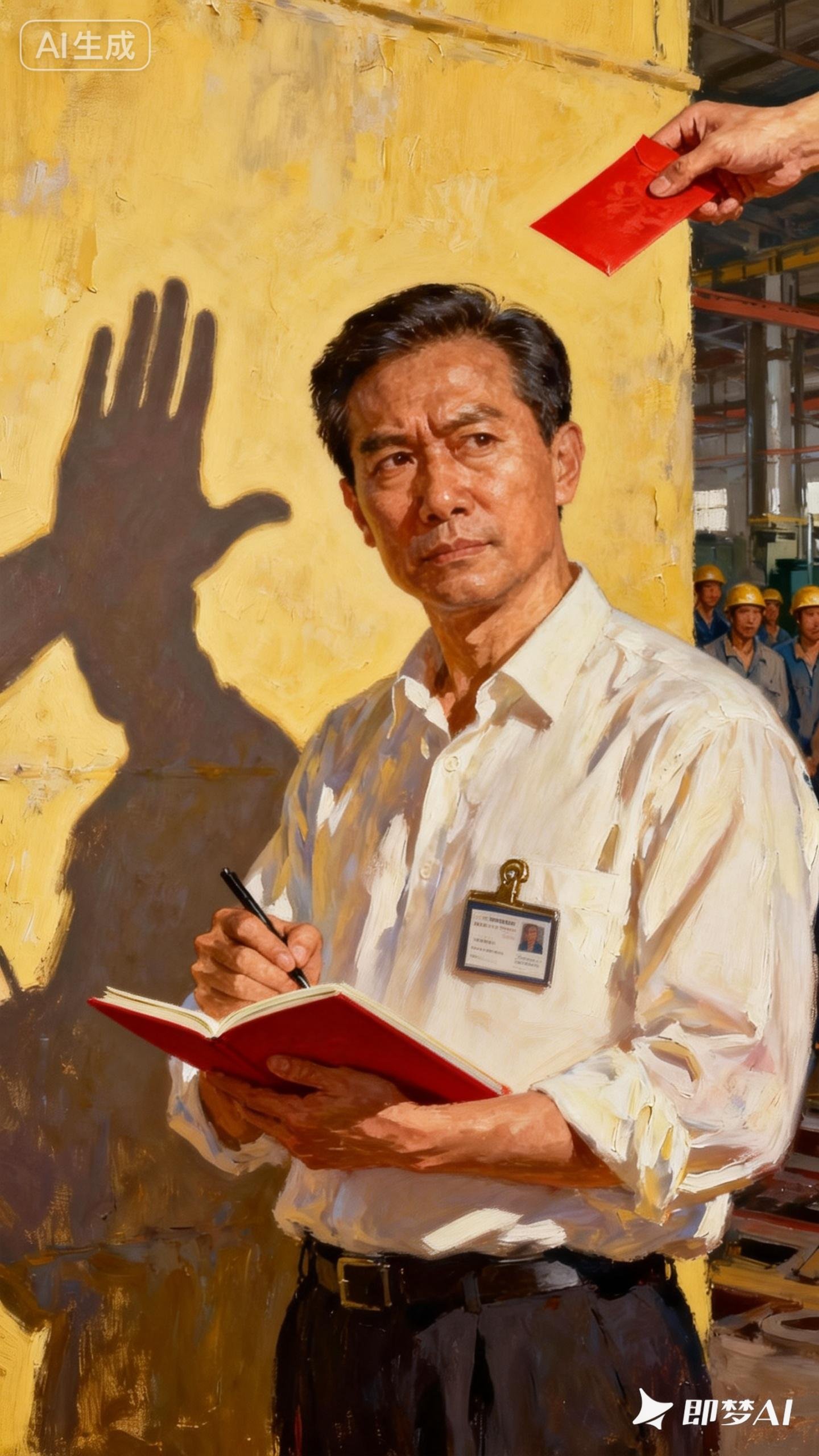 本油画作品以“廉洁为公 抵制贪腐”为主题。明黄背景下,视察工作的干部面对递来的红包,身后影子严词拒绝,犀利眼神尽显拒腐决心。作品以明暗对比手法,彰显公职人员廉洁奉公的高尚情操。