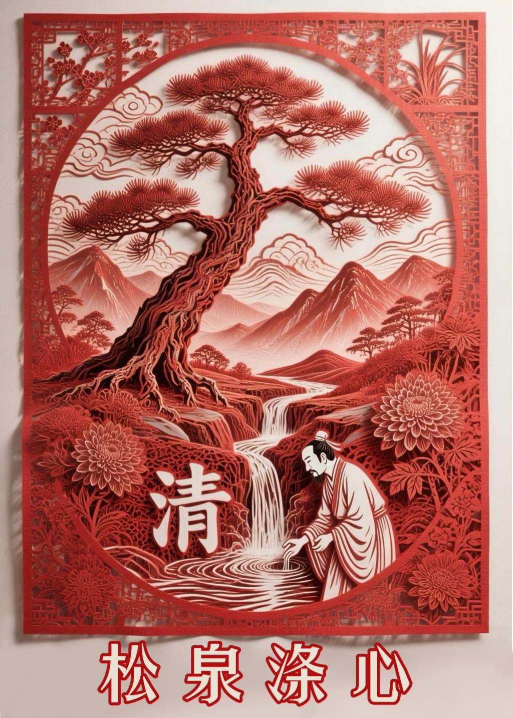 本作品以传统剪纸艺术为载体,以“清”为核心意象创作,通过古士临流掬水的造型,结合苍松、秋菊等象征元素,以水喻廉,以物喻德,展现洁身自好、源清流洁的廉洁精神,层叠的剪纸技法,强化了作品的立体感与文化底蕴。