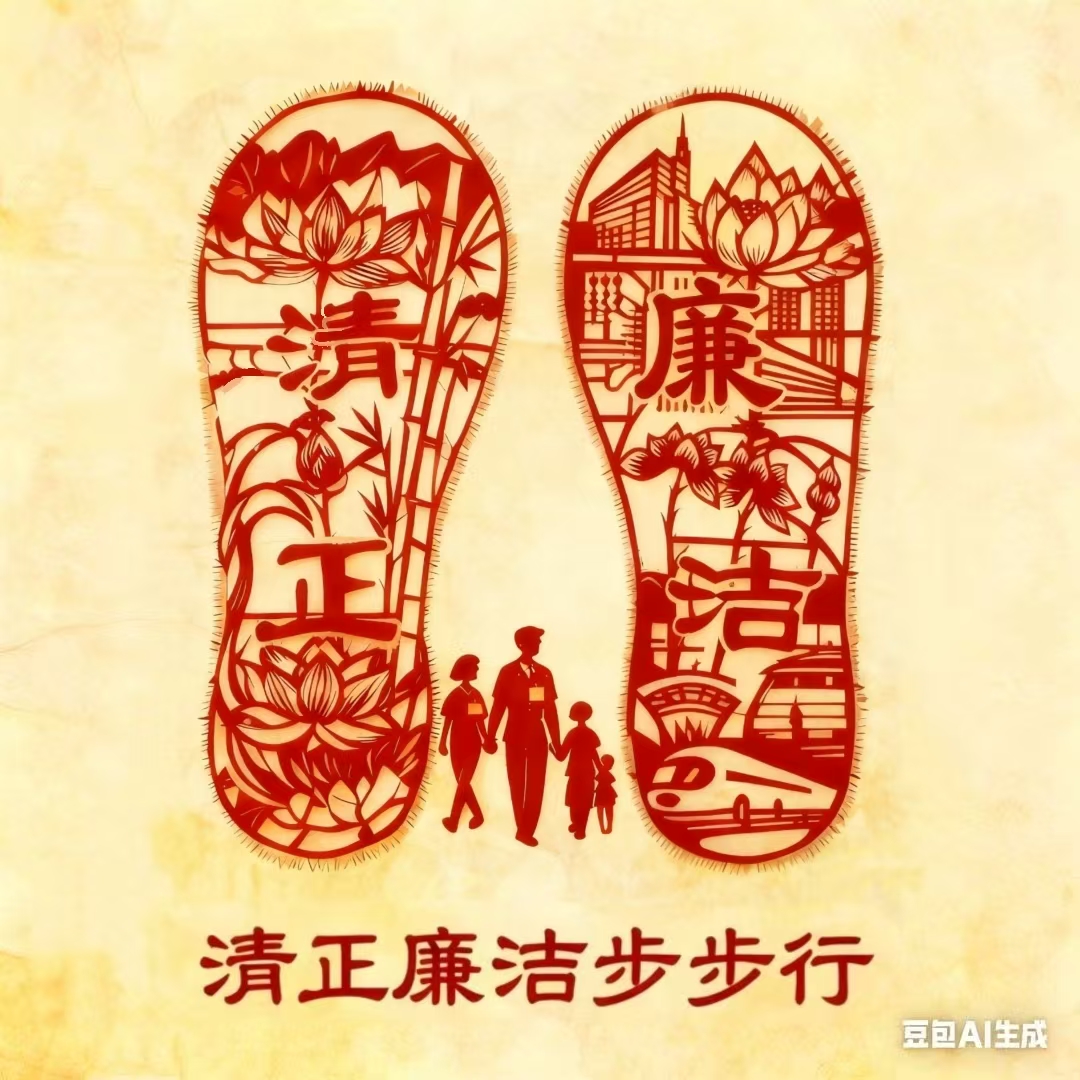 作品以传统文化剪纸艺术为基础,借鉴魏永信剪纸工作室“廉政剪纸”板块作品,结合AI技术进行创新创作。画面融合剪纸艺术与脚印造型,以“清正”“廉洁”字样、竹荷、现代城市及家庭剪影为元素,生动传递坚守清廉、步步守正的廉洁精神,让中华优秀传统文化在AI赋能下成为廉洁理念的新载体。