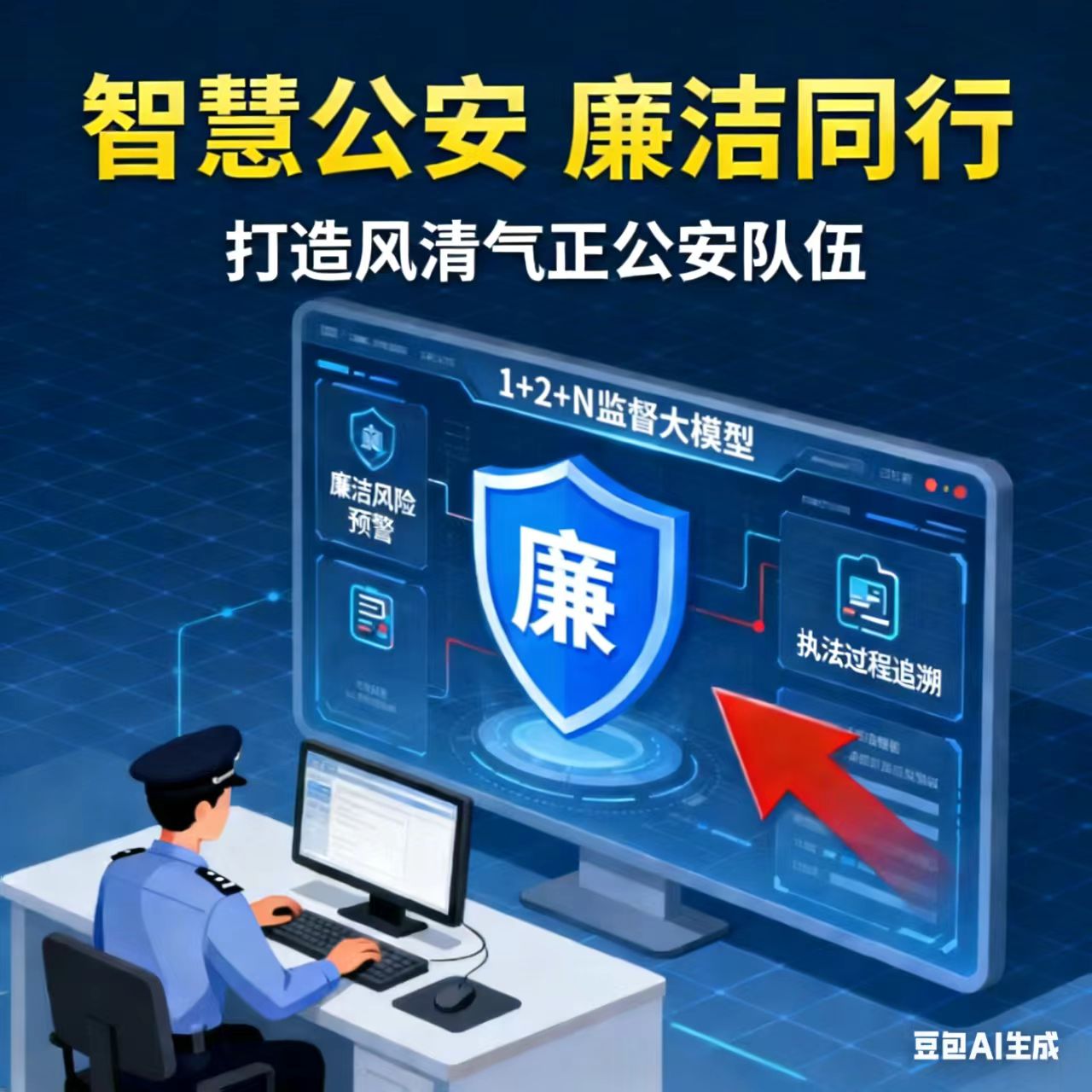本作品以1+2+N云监督大模型为创作核心,展现公安干警依托智慧系统开展廉洁监督工作的场景。画面里干警专注操作设备,大屏呈现廉洁风险预警、执法过程追溯等功能模块,结合“智慧公安 廉洁同行”的主题标语,直观体现科技赋能公安廉洁监督、打造风清气正公安队伍的创新实践。