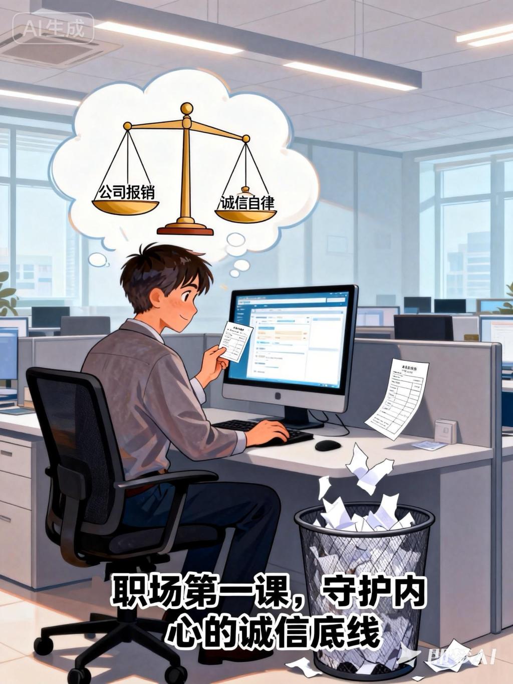 本作品聚焦青年职场廉洁主题,以“公司报销”与“诚信自律”的天平为视觉符号,将职场廉洁的内心抉择具象化,垃圾桶里的废纸则象征着对违规报销的摒弃,点明了“慎独之初”是青年筑牢职场廉洁防线的关键一课。