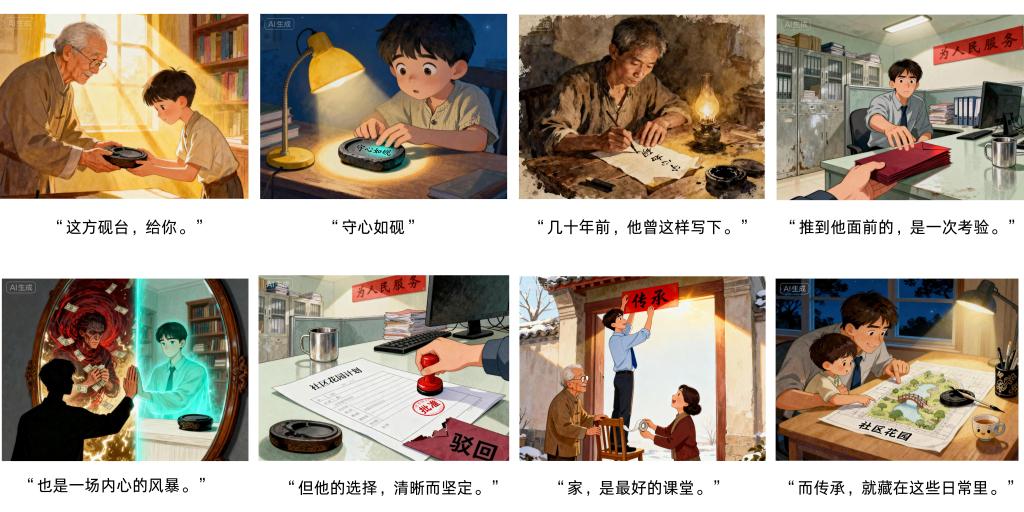 本作品运用“即梦AI”生成,以“一方砚台”为叙事载体,将严肃的廉洁理念融入生活化叙事,通过祖孙三代的故事,生动展现廉洁家风的内化与传承,引导青年一代在价值抉择中坚守初心,自觉成为廉洁文化的践行者与倡导者。